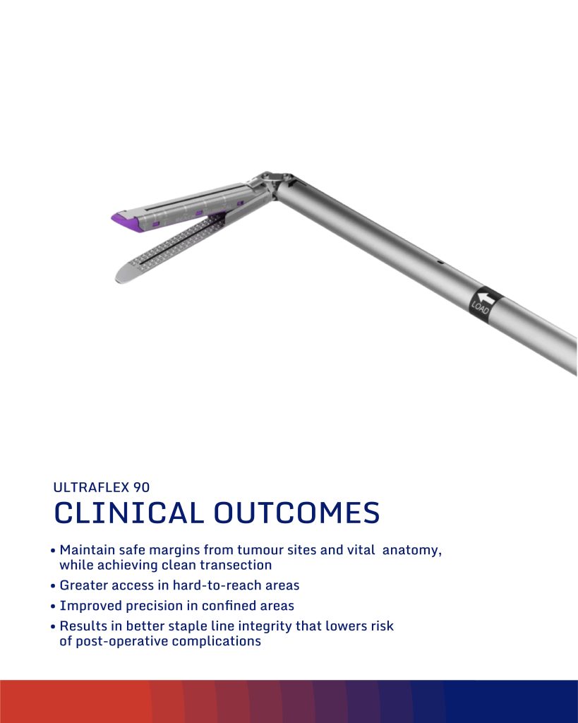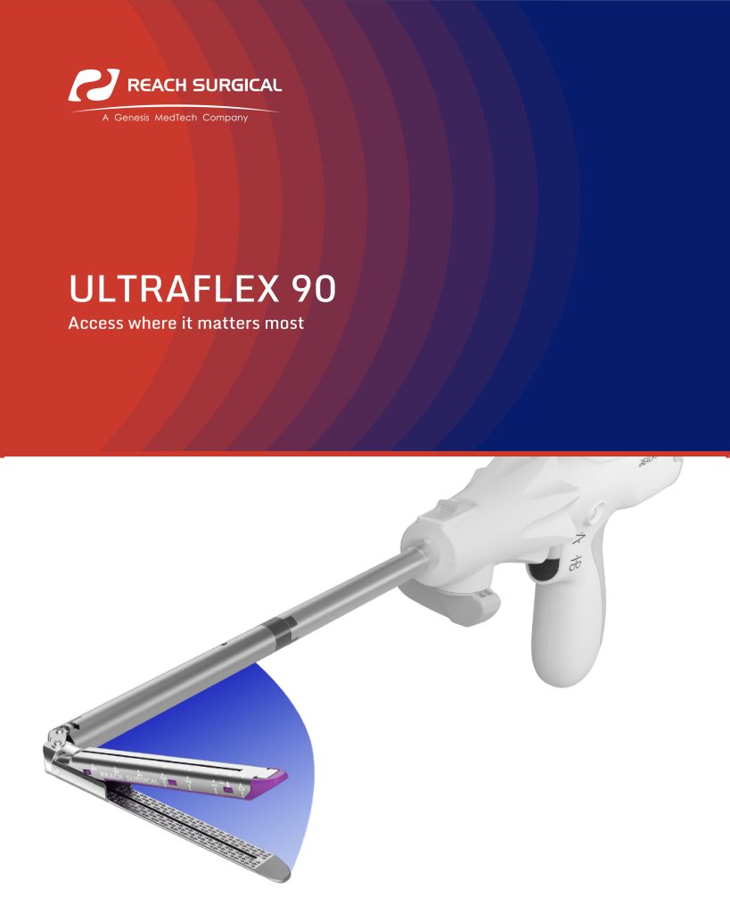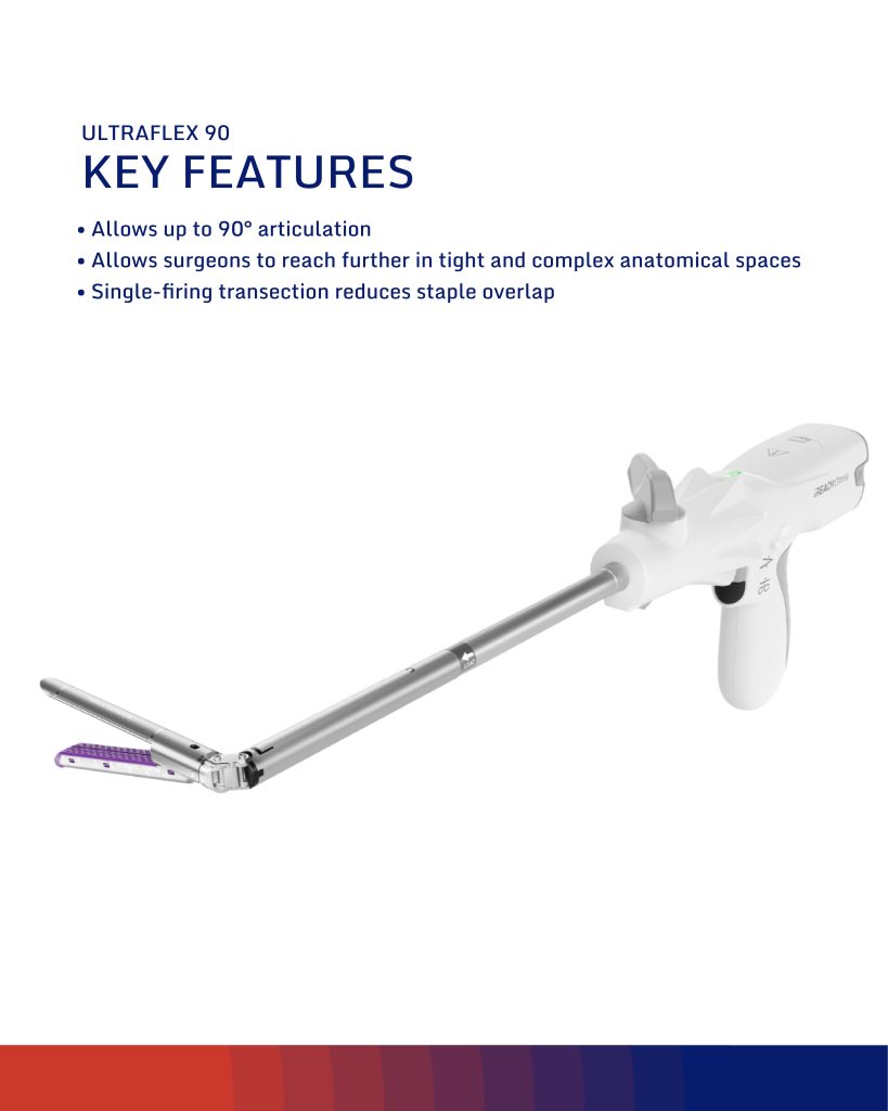 The UltraFlex 90 is designed for greater accuracy in tight anatomy, enabling clean transections while maintaining safe margins from vital anatomy. Its articulation supports a single firing, reducing the risk of leakage caused by crossed staple lines.